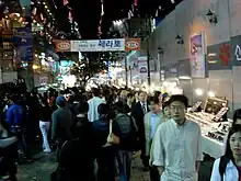 Hongdae is also home to independent clothing stalls, discount and vintage shops, especially along the main thoroughfare of Eoulmadang-ro.[3] The Hongdae Playground, also known as Hongik Children's Park, located between Wausan-ro and Wausan-ro 21-gil opposite Hongik University is home to street vendors who sell their wares in the evenings. On weekends, from March to November at 13:00 to 18:00, flea markets are held on Hongdae Playground (놀이터) that is in front of the main gate of Hongik University. The flea markets are called "Free Market" on Saturdays and "Hope Market" on Sundays.[4][5][6]