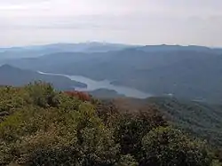 A historic fire tower stands at the summit of Shuckstack, offering a panoramic view of the western Smokies, Yellow Creek, Unicoi, Cheoah, and northern Nantahala mountains. Although no longer in use, the fire tower is accessible to the public. The summit of Shuckstack is accessed via the Appalachian Trail and a short spur trail. The spur trail is marked by a T-shaped white blaze, and is approximately 3.5 miles (5.6 km) from the parking lot on the north side of Fontana Dam. It is considered a strenuous hike due to the rapid elevation gain—approximately 2,300 feet (700 m).