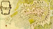 On the night of the 14 July the French opened the trenches using 2,400 workers supported by 10 companies of grenadiers and 5 battalions of infantry.[23] Lowendal used 12,000 of his troops to man the trench lines and deployed the other 18,000 as an army of observation.[24] The first parallel was laid overnight of the first day, 400 paces out from the fortifications. On 17 July the second parallel was dug and over the night of 22 July the third parallel was completed. Batteries were raised and the French artillery began to bombard the defenders on the 20 July. Each of the trench parallels were laid and their saps pushed forward by the French, drawing ever closer to the fortress. The fourth parallel was finished between 26 and 28 July and a fifth laid up against the works on 8 September.[25]