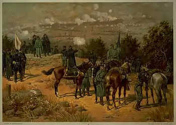 The Chattanooga campaign[7] was a series of maneuvers and battles in October and November 1863, during the American Civil War. Following the defeat of Maj. Gen. William S. Rosecrans's Union Army of the Cumberland at the Battle of Chickamauga in September, the Confederate Army of Tennessee under Gen. Braxton Bragg besieged Rosecrans and his men by occupying key high terrain around Chattanooga, Tennessee. Maj. Gen. Ulysses S. Grant was given command of Union forces in the West, now consolidated under the Division of the Mississippi. Significant reinforcements also began to arrive with him in Chattanooga from Mississippi and the Eastern Theater. On October 18, Grant removed Rosecrans from command of the Army of the Cumberland and replaced him with Major General George Henry Thomas.