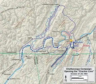 The chief engineer of the Army of the Cumberland, Brig. Gen. William F. "Baldy" Smith, had devised a plan with Rosecrans to open a more reliable supply line to the troops in Chattanooga. General Thomas put the plan afoot immediately upon taking command. Smith briefed Grant immediately after the new commander's arrival and Grant enthusiastically concurred with the plan. Brown's Ferry crossed the Tennessee River from Moccasin Point where the road followed a gap through the foothills, turned south through Lookout Valley to Wauhatchie Station, and then west to Kelley's Ferry, a navigable point on the Tennessee that could be reached by Union supply boats. If the Army of the Cumberland could seize Brown's Ferry and link up with Hooker's force arriving from Bridgeport, Alabama, through Lookout Valley, a reliable, efficient supply line—soon to become known as the "Cracker Line"—would be open. In addition, a force at Brown's Ferry would threaten the right flank of any Confederate movement into the valley.[17]