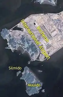 Silmido (Silmi Island) is an uninhabited island in the Yellow Sea, off the west coast of South Korea. It has an area of about 0.25 km2 (62 acres). It lies within the borders of Incheon metropolitan city, and is about 5 kilometres (3 miles) southwest of Yongyu Island where lies the Incheon International Airport. Silmido lies just offshore of the larger, inhabited island of Muuido, which is connected to the mainland by ferry. Most of the island consists of hills that are around 80 metres (300') high.[1]
