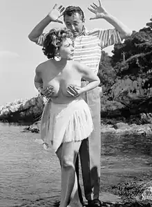 In March 1954 Silva travelled to Cannes for the seventh Film Festival in an attempt to get herself noticed. She succeeded, and the festival organisers awarded her the honorary title of "Miss Festival 1954". She was asked to pose for press photographs with Robert Mitchum on a beach of one of the French Riviera's Lérins Islands, near Cannes. The photocall turned into the story of the festival when Silva removed her top and posed cupping her bare breasts in her hands, while Mitchum played along. Such was the scramble to get the best shots that several photographers were injured in the melée, with two reportedly suffering broken limbs.[2] The press loved it, and the photographs were published around the world. The festival committee, however, were horrified that what they considered a vulgar and cheap publicity stunt had completely overshadowed the serious business of the fortnight, and Silva was asked to leave the festival.[2]