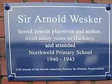 Wesker received numerous awards throughout his career. In 1958 he received grant of £ 300 for the play Chicken Soup from the Arts Council of Great Britain.[27] He used the money to marry Bicker.[6] The following year he won the Evening Standard Theatre Award in the "Most Promising Playwright" category.[28] He was presented with the Italian Marzotto Prize (a cash award of £3000) in 1964 for Their Very Own and Golden City, and the Spanish Best Foreign Play Award in 1979. He became a fellow of the Royal Society of Literature in 1985 and was presented with the Goldie Award in 1987. For his "distinguished service to theatre" he was honoured with the Last Frontier Lifetime Achievement Award in 1999.[27] He was knighted in the 2006 New Year Honours.[1] In December 2021 a plaque in Wesker's memory was installed at his former primary school, Northwold Road, Hackney, London, by the Jewish American Society for Historic Preservation.[29][30]