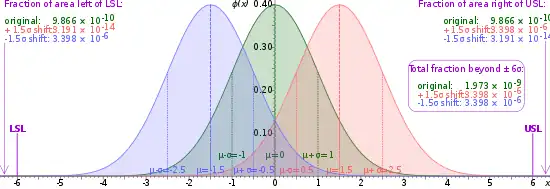 Hence the widely accepted definition of a six sigma process is a process that produces 3.4 defective parts per million opportunities (DPMO). This is based on the fact that a process that is normally distributed will have 3.4 parts per million outside the limits, when the limits are six sigma from the "original" mean of zero and the process mean is then shifted by 1.5 sigma (and therefore, the six sigma limits are no longer symmetrical about the mean).[9] The former six sigma distribution, when under the effect of the 1.5 sigma shift, is commonly referred to as a 4.5 sigma process. The failure rate of a six sigma distribution with the mean shifted 1.5 sigma is not equivalent to the failure rate of a 4.5 sigma process with the mean-centered on zero.[9] This allows for the fact that special causes may result in a deterioration in process performance over time and is designed to prevent underestimation of the defect levels likely to be encountered in real-life operation.[9]