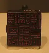 Left: Bronze seal conferred by the Han government upon a Southern Xiongnu chieftain who had submitted to the Eastern Han dynasty (25–220). The seal was unearthed in Shangsunjiazhai, Datong Hui and Tu Autonomous County, Qinghai province in 1979. The Southern Xiongnu that settled in modern-day Hexi Corridor and eastern Qinghai during the Eastern Han dynasty were also known as the Lushui Hu and intermixed with the local Qiang. Juqu Mengxun, who seized control of the Northern Liang kingdom in 401 was a Lushui Hu chieftain.[1] Right: An iron sword with a ring-shaped pommel of the Xianbei from the Western Jin dynasty (266–316) unearthed in Meiligaitu Village, Zhuozi County, Ulanqab, Inner Mongolia. During the Western Jin, the Tuoba Xianbei clan settled in modern-day central Inner Mongolia.[2]