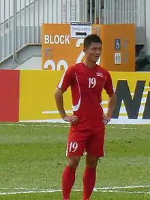 He has played for the North Korean national team since 2014.[4] He was part of the North Korean squad at the 2015 AFC Asian Cup where they reached the final.[5][6][7]