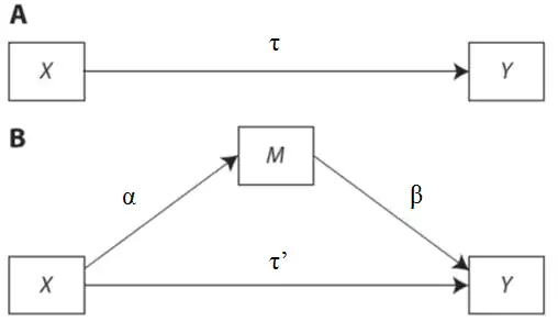From these models, the mediation effect is calculated as (τ – τ').[4] This represents the change in the magnitude of the effect that the independent variable has on the dependent variable after controlling for the mediator. From examination of these equations it can be determined that (αβ) = (τ – τ'). The α term represents the magnitude of the relationship between the independent variable and the mediator. The β term represents the magnitude of the relationship between the mediator and dependent variable after controlling for the effect of the independent variable. Therefore (αβ) represents the product of these two terms. In essence this is the amount of variance in the dependent variable that is accounted for by the independent variable through the mechanism of the mediator. This is the indirect effect, and the (αβ) term has been termed the product of coefficients.[5]