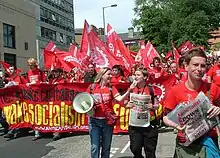 In 2011, the Socialist Party gave prominent support to the Jarrow March for Jobs,[8] a 330-mile march from Jarrow in South Tyneside to London to highlight youth unemployment,[9] supported by several MPs,[10] eight trade unions[11] and the Daily Mirror newspaper.[12] Kevin Maguire, associate editor of the Daily Mirror, spoke at the Jarrow launch rally, following the Socialist Party's Coventry councillor Dave Nellist, as featured on a number of Socialist Party videos about the event.[13] The Jarrow march featured prominently at the Socialist Party's 'Socialism 2011' weekend event in November 2011, which coincided with the marchers' arrival in London.[14]