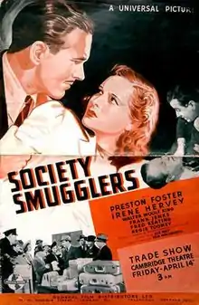 Society Smugglers is a 1939 American crime film directed by Joe May and starring Preston Foster, Irene Hervey and Walter Woolf King.[1] It was made and distributed by Universal Pictures. The film sets were designed by the art director Jack Otterson.