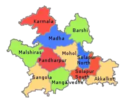 | Tehsils | 1. Akkalkot, 2. Barshi, 3. Karmala, 4. Madha, 5. Malshiras, 6. Mangalwedha, 7. Mohol, 8. Pandharpur, 9. Sangola, 10. North Solapur and 11. South Solapur |