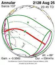 | 137 | 42 | August 25, 2128 | 23:44:34 | Annular | 9.8S 180E | -0.3562 | 0.9694 | 117 | 3m 41s | |