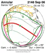 | 137 | 43 | September 6, 2146 | 6:44:00 | Annular | 17.8S 72.6E | -0.4249 | 0.9639 | 143 | 4m 13s | |