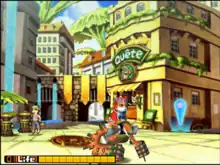 Solatorobo is an action role-playing game where players control Red, an adventurer who pilots his own small mecha equipped with long arms that can grab and throw objects or enemies. Red can throw enemies into one another, as well as repeatedly toss and re-throw the same enemy in a combo to deal extra damage. Each time an enemy is defeated, Red gains experience points that allow him to gain levels, making him stronger and increasing his health. His mecha can be upgraded and customized by purchasing parts with currency called "rings", which consist of simple geometric shapes that fit into slots unlocked by finding "P. Crystals" throughout the game. As the story progresses, he gains new offensive abilities such as swinging an opponent around or firing projectiles. The player may also allow Red to exit his machine at any time, giving him the ability to swim, climb ladders, activate panels or switches, and immobilize enemies with his stun gun.