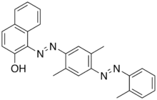 Its main use is as a standard fuel dye in the US mandated by the US IRS to distinguish low-taxed or tax exempt heating oil from automotive diesel fuel, and by the EPA to mark fuels with higher sulfur content; it is however increasingly replaced with Solvent Red 164, a similar dye with longer alkyl chains, which is better soluble in hydrocarbons.[1] The concentration required by IRS is a spectral equivalent of 3.9 pounds per 1000 barrels, or 11.13 mg/L, of Solvent Red 26 in solid form; the concentrations required by EPA are roughly 5 times lower.