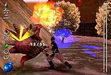 Amakawa created the story concept of a fantasy set in modern-day Japan. While games based on Japanese folklore had seen little success at the time, Square allowed Yuke's total creative freedom and Amakawa decided to go ahead with the concept.[14] The characters were designed by artist Natsuki Sumeragi.[15] Enemy designs were handled by Takeshi Tanaka.[10] The various level areas were based on the Japanese regions in which they were set, although they were made more fantastic due to the game's premise.[15] Soukaigi included full voice acting, with several prominent Japanese actors portraying the main cast; Square told Yuke's that they need not be concerned with the casting budget, which was large enough to surprise Yuke's staff.[9] The game featured two and a half hours of real-time cutscenes integrated into gameplay.[15]