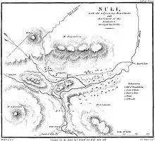 Other attacks in the same era include that Dost Bey, commander of Delvinë (1759) and Mahmoud Aga, governor of Arta (1762).[62] During 1721–1772 the Souliotes managed to repulse a total of six military expeditions. As a result, they expanded their territory at the expense of the various Ottoman lords.[64] Souliotes participated in the Orlov revolt that broke out around 1770 against Ottoman Empire, with the help of Russia. Many of the joined the Russian fleet. Their revolt was connected with the acts of Russian agents in Epirus, which continued till the 2nd Russo-Turkish War (1787–1792). The Russian agent Ludovicos or Luigi Sotiri (a doctor from Lefkada) came to Souli probably in 1771, carrying a letter from Alexei Grigoryevich Orlov, guns and ammunition and urged Souliotes to revolt. The Turks, who got informed on the movements of Souliotes, in March 1772 sent against them an army of 5.000 Muslim Albanians, who were defeated and their leader Suleyman was captured. The hostilities lasted till mid 1772.[65] According to other source the Souliotes were attacked by 9.000 men under Suleyman Tsapari. In 1775, Kurt Pasha sent a military expedition to Souli that ultimately failed. During the Russo-Turkish War (1768–74), the inhabitants of Souli, as well as of other communities in Epirus were mobilized for another Greek uprising which became known as Orlov Revolt.[60] In 1785 it was the time of Bekir pasha to lead another unsuccessful attack against them.[66] In March 1789, during the Russo-Turkish War (1787–1792) the chieftains of Souli: Georgios and Dimitrios Botsaris, Lambros Tzavellas, Nikolaos and Christos Zervas, Lambros Koutsonikas, Christos Photomaras and Demos Drakos, agreed with Louitzis Sotiris, a Greek representative of the Russian side, that they were ready to fight with 2,200 men against the Muslims of Rumelia. This was the time when Ali Pasha became the local Ottoman lord of Ioannina.[60]
