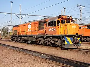 The Class 37-000 type GT26M2C diesel-electric locomotive was designed for the South African Railways (SAR) by General Motors Electro-Motive Division (GM-EMD) and built by General Motors South Africa (GMSA) in Port Elizabeth. Equipped with later model GM-EMD D31 traction motors instead of the earlier GM-EMD D29B, it is a more powerful version of the GM-EMD type GT26MC Classes 34-200, 34-600 and 34-800.[2]