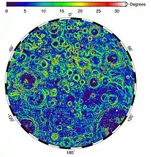 The lunar south pole features a region with crater rims exposed to near-constant solar illumination, yet the interior of the craters are permanently shaded from sunlight. The area's illumination was studied using high-resolution digital models produced from data by the Lunar Reconnaissance Orbiter.[7] The lunar surface can also reflect solar wind as energetic neutral atoms. On average, 16% of these atoms have been protons that vary based on location. These atoms have created an integral flux of backscattered hydrogen atoms due to the reflected amount of plasma that exists on the surface of the Moon. They also reveal the line boundary and the magnetic dynamics within the regions of these neutral atoms on the Moon' surface.[8]