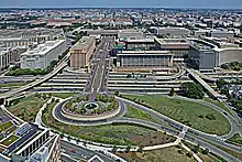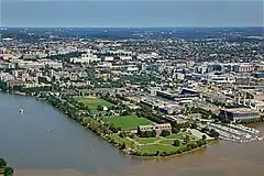L'Enfant Plaza has also undergone a facelift, with new retail and hotels, as well as office renovations having been completed in the late 2010s.[12] In April 2017, the National Capital Planning Commission (NCPC) approved plans for a staircase and ramp that will travel through a grassy slope in Benjamin Banneker Park to connect L'Enfant Plaza to the Southwest Waterfront and to add lighting and trees to the area. The NCPC and the National Park Service intended the project to be an interim improvement that could be in place for ten years while the area awaits redevelopment.[13] Hoffman-Madison Waterfront (the developer of "The Wharf") and the District of Columbia government agreed to invest $4 million in the project in an effort to improve neighborhood connectivity in the area. Construction began on the project in September 2017.[14]