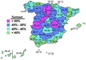 A referendum on the Treaty establishing a Constitution for Europe was held in Spain on Sunday, 20 February 2005.[1] The question asked was "Do you approve of the Treaty establishing a Constitution for Europe?" (Spanish: ¿Aprueba usted el Tratado por el que se establece una Constitución para Europa?). The consultative referendum on ratification of the proposed Constitution for the European Union was approved by 81.8% of valid votes, although turnout was just 41.8%,[2][3][4] the lowest since the end of the Franco era.[5]