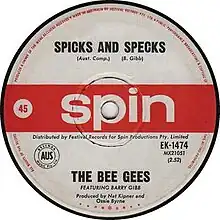 "Spicks and Specks" is a song by the Bee Gees, written by Barry Gibb. When the song was released in September 1966, the single reached No. 4 on the Go-Set Australian National Top 40[2] (No. 1 on other Australian charts),[3][4] and when the song was released in other countries in February 1967, it reached No. 28 in Germany, No. 2 in the Netherlands and No. 1 in New Zealand.[1]