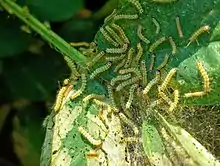 Each female lays up to 1000 eggs on the undersides of leaves in several batches. When these hatch, the larvae at first scrape the under surface of the leaf, but as they grow they feed on the edges of the leaves, giving these a net-like appearance. When sufficiently numerous, they may defoliate the plant.[3] There are a number of natural enemies of these caterpillars, and in the jute crop in India, the braconid wasp Protapanteles obliquae is one of these. The wasp lays its eggs in the first instar caterpillar. By the second or third instar, the wasp larvae are fully grown and thrust their way out through the caterpillar's ventral surface, forming small, woolly, white chrysalises. By this time, the caterpillar is moribund or dead.[3]