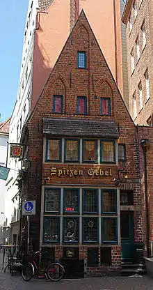 Dating from the time around 1400, the Spitzen Gebel is the oldest town house[2] and the last of its kind in Bremen. The building has served as both a shop and a private residence over the centuries.[3] Its Low German name stems from the pointed gable crowning its facade. It was a wine house, a butcher's shop and a tavern until in 1913 it became an office for the Vereinigten Klavierträger (united piano movers). As a result, the older residents of Bremen still remember it as the Klavierträgerhaus (piano movers' house).[4]