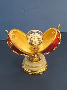 The Spring Flowers egg, sometimes referred to as the Imperial Spring Flowers egg, was considered one of the Imperial Easter eggs attributed to Peter Carl Fabergé (and therefore one of the Fabergé eggs). If it is an authentic Imperial egg, then the Spring Flowers egg would have been the first in the series of "flower eggs" and would have been created between 1885 and 1890. It consists of a case made of white maple covered in leather with steel hinges and clasps containing a smaller egg (the official "Fabergé" egg) decorated in red enamel and gold scroll work placed upright on a small stand of carved bowenite which then opens vertically to reveal a fully removable bower of flowers made of garnets and white chalcedony in a basket of platinum.[1][2] The red egg stands 3.25 inches (83 mm) high, and the bower inside it 1.5 inches (38 mm).[3] It was purchased by Russian businessman Viktor Vekselberg in 2004 as part of a collection of such eggs and various other Fabergé items.[4][5]