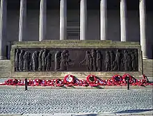 This is the flat space between the hall and the railway station and contains statues of four lions by Nicholl and cast iron lamp standards with dolphin bases. Also on the plateau are monuments, including equestrian bronzes of Prince Albert and Queen Victoria by Thomas Thornycroft, and a monument to Major-General William Earle by Birch. Between the equestrian statues is the Grade I Liverpool Cenotaph which was unveiled in 1930, designed by L. B. Budden and sculpted by H. Tyson Smith. It consists of a simple horizontal block with a bronze relief measuring over 31 feet (9 m) on each side. Sharples and Pollard regard it as one of the most remarkable war memorials in the country.[20]