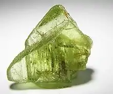 Historic specimen of forsterite var. peridot, 1.3 cm × 0.7 cm × 0.4 cm (0.5 in × 0.3 in × 0.2 in). Mining of peridot seems to have begun around 300 BC.