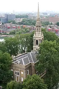 The old parish church, traditionally known as the Church of Sea Captains, was built in 1656, and was principally financed by Thomas Neale. It is believed that 75 sea captains are buried at the Church.[1] Matthew Mead was minister of the chapel from 1658 until 1662, when he was replaced after the Restoration for being too non-conformist.[2][3] During the Great Plague of London it was one of five sites in the parish of Stepney used as plague pits.[4][5] It was rebuilt in 1669 as the Parish Church of Shadwell, and in an Act of 1670 by Archbishop of Canterbury William Sancroft, St Paul's Shadwell became a separate parish from St Dunstan's, Stepney, where it had previously been a hamlet.[6][7] The church was named after St Paul's Cathedral, and became the first parish created from St Dunstan's, Stepney since Whitechapel in 1338.[8] John Wesley was a preacher at St Paul's. Captain James Cook worshipped there, as did Jacob Phillip, the father of Captain Arthur Phillip, the first Governor of New South Wales.[9] Cook's eldest son was baptised at St Paul's Church in 1763. Also baptised there were William Henry Perkin, the chemist who discovered the first aniline dye, and Jane Randolph, mother of Thomas Jefferson.[1][10] The 1669 church was built in brick, and measured 87 feet (27 m) by 63 feet (19 m).[11]