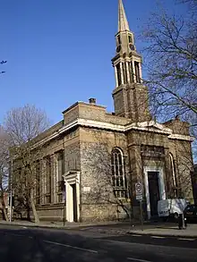 The building, designed by James Pennethorne, stands on the corner of Redhill Street (formerly Edward Street) and Albany Street. It is not strictly orientated, its ceremonial east end, with the altar, facing slightly west of north.[1] It is rectangular in plan, and built of brick with stucco and stone dressings, its four corners emphasised by wide tower-like features, projecting slightly beyond the main lines of the walls. The architecture is broadly classical in style. A deep stucco entablature runs around the whole building, with a simple brick parapet above it. The windows are round-headed.[1] There is a tower above the entrance, topped by an octagonal spire.[1] The steeple is unusually small in comparison with the main body of the church.[2]