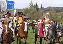 St. George's Day was a major feast and national holiday in England on a par with Christmas from the early 15th century.[18] The tradition of celebration St. George's day had waned by the end of the 18th century after the union of England and Scotland.[19] Nevertheless, the link with St. George continues today, for example Salisbury holds an annual St. George's Day pageant, the origins of which are believed to go back to the 13th century.[14] In recent years the popularity of St. George's Day appears to be increasing gradually. BBC Radio 3 had a full programme of St. George's Day events in 2006, and Andrew Rosindell, Conservative MP for Romford, has been putting the argument forward in the House of Commons to make St. George's Day a public holiday. In early 2009, Mayor of London Boris Johnson spearheaded a campaign to encourage the celebration of St. George's Day, and during the 2017 and 2019 General Elections the Labour Party campaigned for it to be a public holiday.[20] Today, St. George's day may be celebrated with anything English including morris dancing and Punch and Judy shows.[21]