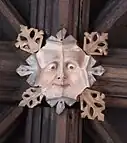 Over the nave and chancel is a continuous camber-beam and panel oak ceiling with diagonal cross-braces, large carved bosses at the junctions of the main beams and smaller ones at the junctions of the secondary beams.[2] There are no memorials of distinction and most of the old fittings were discarded in the 19th-century restorations. A 17th-century altar table is still present.[6] The three-manual organ was built between 1870 and 1880 by Young and Son and later rebuilt by Charles A. Smethurst.[18] The clock is a double three legged gravity feed made by engineers W. H. Bailey of Salford.[19] Taking the place of a still earlier clock mentioned in the churchwardens' accounts[20] it was installed in 1888[21] and refurbished in 1911.[22] There is a ring of eight bells cast by John Taylor and Company of Loughborough in 1911.[23] The earliest mention of bells in the churchwardens' accounts is in 1692. Until 1877 there were six bells, two more being cast by Taylor's and added that year. All eight bells were taken down, recast and rehung in 1910, again by Taylor's.[22] Inscriptions on the bells before they were recast showed five had been cast in 1712 and one in 1852: the inscription on the No. 5 bell at the time of the 1910 recasting read "Richard Sanders of Bromsgrove[24] made us all six".[25] The parish registers begin in 1561 and the churchwarden's accounts date from the 17th century.[6]
