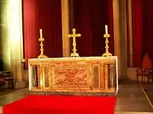 However, as yet the baldacchino has not been constructed. In front of the altar in the sanctuary floor are two pieces of mosaic from the Holy Land, brought back after being uncovered during the First World War by the Australian Light Horse Regiment. One of these is part of the floor of a 6th-century synagogue at Jericho. The other is a fragment from the floor of a 6th-century Christian church at Gaza and is part of a larger mosaic now housed in the Australian War Memorial in Canberra.[12] Beyond the high altar the cathedral ends in a semicircular apse and ambulatory (processional aisle), a link to the architecture's French-Norman past.[23] Many features beyond the crossing including the altar, cross, candle sticks, pulpit, canopy, clergy stalls, pendant lights and litany desk were designed by Frank Pearson. He also designed the carved organ case and the rose window in the north transept.[23]