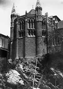 It was a cruciform church with a wide nave, double aisles, apse and ambulatory, short transepts about halfway along the length of the building and an apsidal side chapel on the north. The west front had towers close to the end of the nave. The upper part of the west wall was supported by a relieving arch, which continued the line of the interior cross arches. The towers had massive buttresses. Their strong vertical lines carried on into corner turrets set before pyramidal spires.[5]