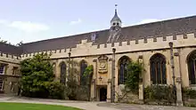 Three houses at 2–4 St Giles' formed the Dolphin Inn. When demolished in 1881 the houses were known as the South Buildings, and used as college accommodation.[41] In 1947–48 the college constructed, at a cost of £43,216, the neo-Georgian Dolphin Quadrangle on the site. It was designed by Edward Maufe.[42] There was a shortage of construction materials in the immediate aftermath of the Second World War, but the college built the new quadrangle with its own timber, stored in Bagley Wood, still owned by the college.