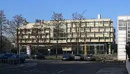 Under the Nazi regime, in 1941, the academy was organically linked with the School of Applied Arts (Württembergische Staatliche Kunstgewerbeschule, founded in Stuttgart in 1869) under the name Staatliche Akademie der Bildenden Künste Stuttgart (State Academy of Fine Arts Stuttgart), with each institution retaining its previous location. After World War II, the institution maintained this name when it was reconstituted in 1946 from Theodor Heuss, the first Minister of Education and Cultural Affairs in the state of Württemberg-Baden, with free and applied disciplines. At that time, as her own buildings in downtown Stuttgart (Urbanstraße 37/39) had been destroyed during air raids in 1943 and 1944, the academy moved into the building of the former School of Applied Arts, built on the Weißenhof in 1913 under the direction of Bernhard Pankok. Already in 1906, Pankok had suggested the connexion of the Royal Academy of Fine Arts and the Royal School of Applied Arts and her workshops (Lehr- und Versuchswerkstätte, founded in 1901). He had planned, more than ten years before the Bauhaus, an art school uniting all artistic disciplines on the Weißenhof area, but had found no resonance in Stuttgart.[5] It was not until the winter semester of 1956/57 that the academy was extended for the first time on the Weißenhof area with the move into a newly built ″Sculptor′s building″ (″Bildhauerbau″).[6]