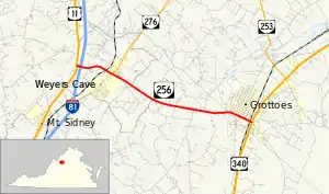 State Route 256 (SR 256) is a primary state highway in the U.S. state of Virginia. Known for most of its length as Weyers Cave Road, the state highway runs 6.78 miles (10.91 km) from U.S. Route 11 (US 11) near Weyers Cave east to US 340 in Grottoes. SR 256 connects Interstate 81 (I-81) with Weyers Cave in northern Augusta County and Grottoes, which is home to Grand Caverns, in southeastern Rockingham County.