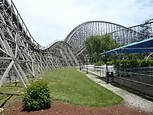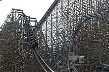Mean Streak's wooden track was approximately 5,427 feet (1,654 m) in length and the height of the lift hill was approximately 161 feet (49 m).[7] It was constructed from more than 1.5 million board feet (4,000 m³) of treated southern yellow pine.[11] In 1994, a trim brake was installed on the first drop reducing its overall speed in an attempt to prevent abnormal track wear and increase ride comfort.[9] Over the years, Mean Streak had been re-tracked several times. Some re-tracking was completed by Martin & Vleminckx.[37] Prior to the 2012 operating season, many sections of track after the first drop were replaced. This was the most significant work done on the ride since it opened.[38] Also, in 2012, a portion of the queue was removed to make room for a new building. The building is located in the infield of Mean Streak and is used for the HalloWeekends haunted house, Eden Musee. It is also used for storage during the off-season and summer.[39]