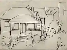 Hirsch's drawing, House, of 1920 shows some influences of Cézanne and the cubists in its juxtaposed panels and emphasis on the two-dimensional surface of the paper. Its spare, geometric design was typical of his style during this decade. His painting, Lower Manhattan, of either 1920 or 1921, is one of his best known pieces. It possesses the "essential flatness" of most of his output and shows his artistic skill in its overall design, coloration and balanced tonal relations.[3][11][12][13]