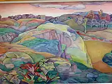 Some of the most colorful paintings came from visits he made to Mexico from 1929 to 1933. A small one, Kachinas shows the same careful handling of tones and balancing of pictorial elements as in his earlier work, but its colors are intense and its treatment realistic. The figures shown are Hopi spirit-figures, one of whom is performing a ritual snake dance.[30] Other subjects from these trips include burros, a bullfight scene, musicians, and an allegorical painting of a priest, soldiers, a man with a bag of money, and three peasants slumbering.[31][32]