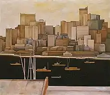 Stefan Hirsch (January 2, 1899 – September 28, 1964) was an American artist. Many of his paintings have the hard edges, smooth surfaces, and simplified forms of the precisionists and their typical subjects—cityscapes and industrial scenes—are sometimes also his, but in general his works have an emotional element and, as one critic as said, "take on an otherworldly tone" that sets them apart.[1] In addition to work showing a personal version of precisionism, he produced paintings, drawings, and prints in the social realist, Mexican muralist, and surrealist styles as well as still lifes, portraits, and landscapes that defy easy classification. His work achieved critical recognition from 1919 onward, has been widely collected, and is today found in many American museums including the Phillips Collection, the Whitney Museum of American Art, the Metropolitan Museum of Art, and the Corcoran Gallery.[2][3][4]