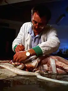 ![]() O'Shea dissecting a 30-kilogram giant squid in 1999 | |