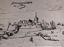 Unlike the other castles of East Friesia, Stickhausen Castle was never the seat of the East Frisian chieftains. It was built around 1345 by the city of Hamburg to protect their westbound trade routes. After intense debate, the Hamburg pledged them in about 1453 to the chieftain and later to Count Ulrich I of East Frisia. This castle was built as the replacement for the older border fortress Schlüsselburg in Detern. This fortress had been part of a border defense line against the adjacent County of Oldenburg and secured access to East Frisia.[2] After the Schlüsselburg fortress had been destroyed and rebuilt several times, it lost its importance after the construction of Stickhausen Castle and is no longer mentioned in documents.