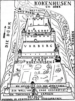 ![]() A drawing of Kokenhusen and its fortress about 30 years prior to the storming. | |||||||