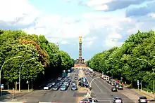 The Straße des 17. Juni (German pronunciation: [ˈʃtʁaːsə dɛs ˈziːpˌt͡seːntn̩ ˈjuːni] ⓘ, English: 17th of June Street), is a street in central Berlin, the capital of Germany. Its name refers to the 17 June 1953 uprising in East Germany. It is the western continuation of the boulevard Unter den Linden. It runs east–west through the Tiergarten, a large park to the west of the city centre. At the eastern end of the street is the Brandenburg Gate and the Platz des 18. März, it then passes the Soviet War Memorial before passing either side of Victory Column (Siegessäule) in the middle of the park, and out of the park through the Charlottenburg Gate, terminating about half a kilometre later at Ernst-Reuter-Platz. The street is a section of the main western thoroughfare radiating out from the centre of Berlin so the road continues to the west of Ernst-Reuter-Platz, the first section of which is called Bismarckstraße.