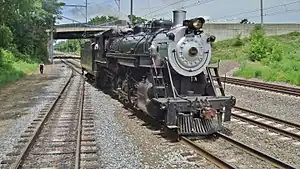 No. 90 originally operated on the Great Western Railway of Colorado to the company's towering mill in Loveland, Colorado where it hauled sugar beet trains.[1] It was purchased by the Strasburg Rail Road on April 5, 1967 for a price of $23.000.00, it arrived on property a month later on May 5, 1967.[1][2][26] Upon arrival, No. 90 would make its first run for Strasburg on May 13, 1967.[2][26] The engine is occasionally repainted into different paint schemes for photo charters, such as the Great Western Railway (Colorado) scheme in a 2013 charter.[27][1][28] In April 2023, No. 90 was taken out of primary service in preparation to undergo its Federal Railroad Administration (FRA) 1,472-day inspection and overhaul, which is set to begin in late 2023 or early 2024.[29][30][3]