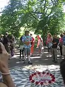 One of its best-known visitors was Gary dos Santos, a devoted Beatles fan who decorated the memorial in circles of different flowers and objects, often in the shape of a peace symbol.[16] Born Ayrton "Gary" Ferreira dos Santos Jr.,[17] he was a performance artist who for 19 years installed flower designs around and within the "Imagine" mosaic here.[18] His work has been documented in The New York Times. Dos Santos' income came from the tips he received from tourists as a result of his work, and the three-minute monologue he delivered to tourists describing his work and the life of John Lennon and his family.[18][19] Santos was the subject of a documentary film, The Mayor of Strawberry Fields, directed by Torre Catalano and distributed by Nehst Studios.[19]